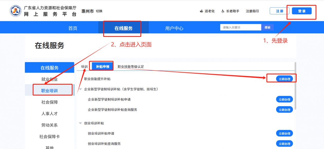 广东省职业技能提升补贴申领管理信息系统入口:https://ggfw.hrss.gd.gov.cn/gdggfw/online-service?moduleId=9
