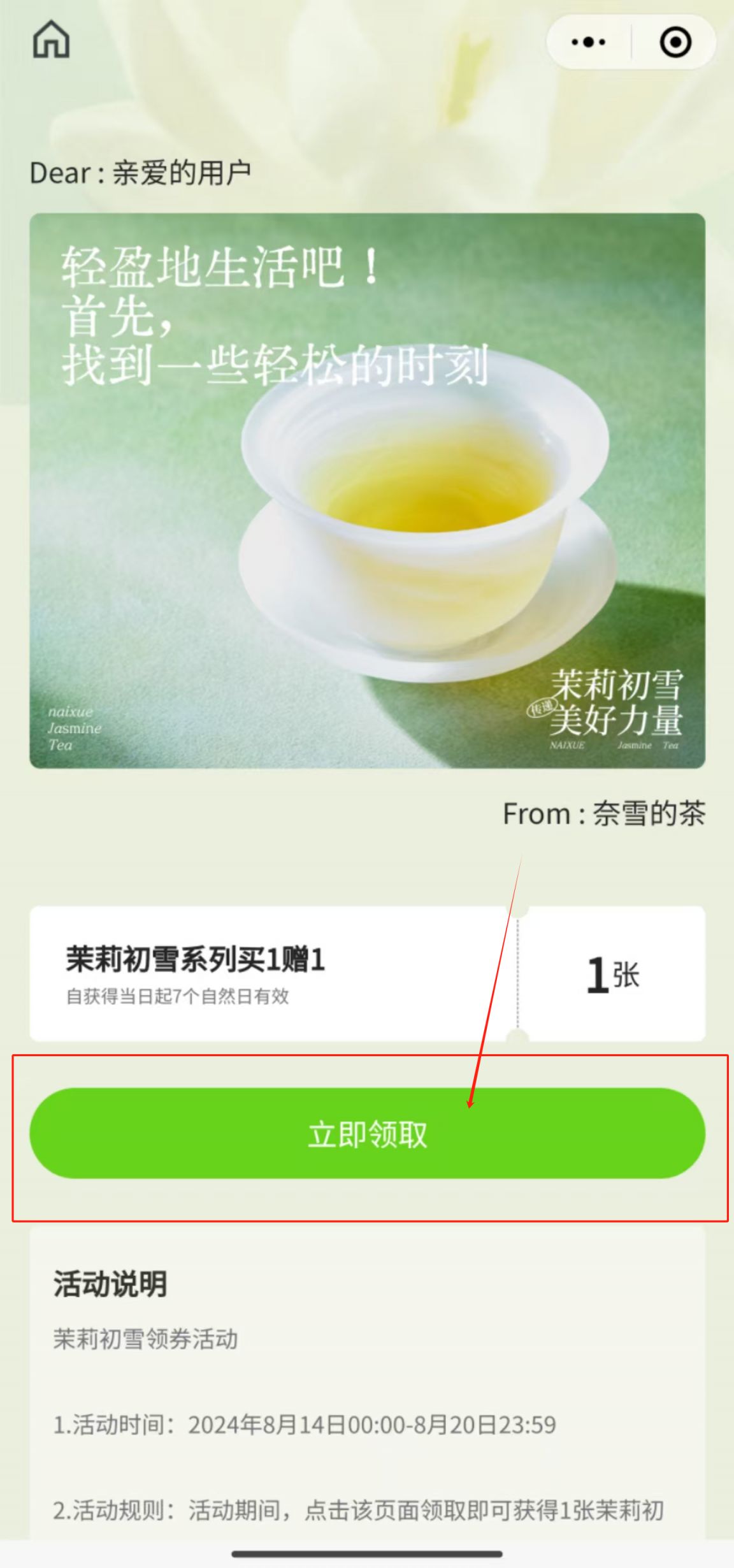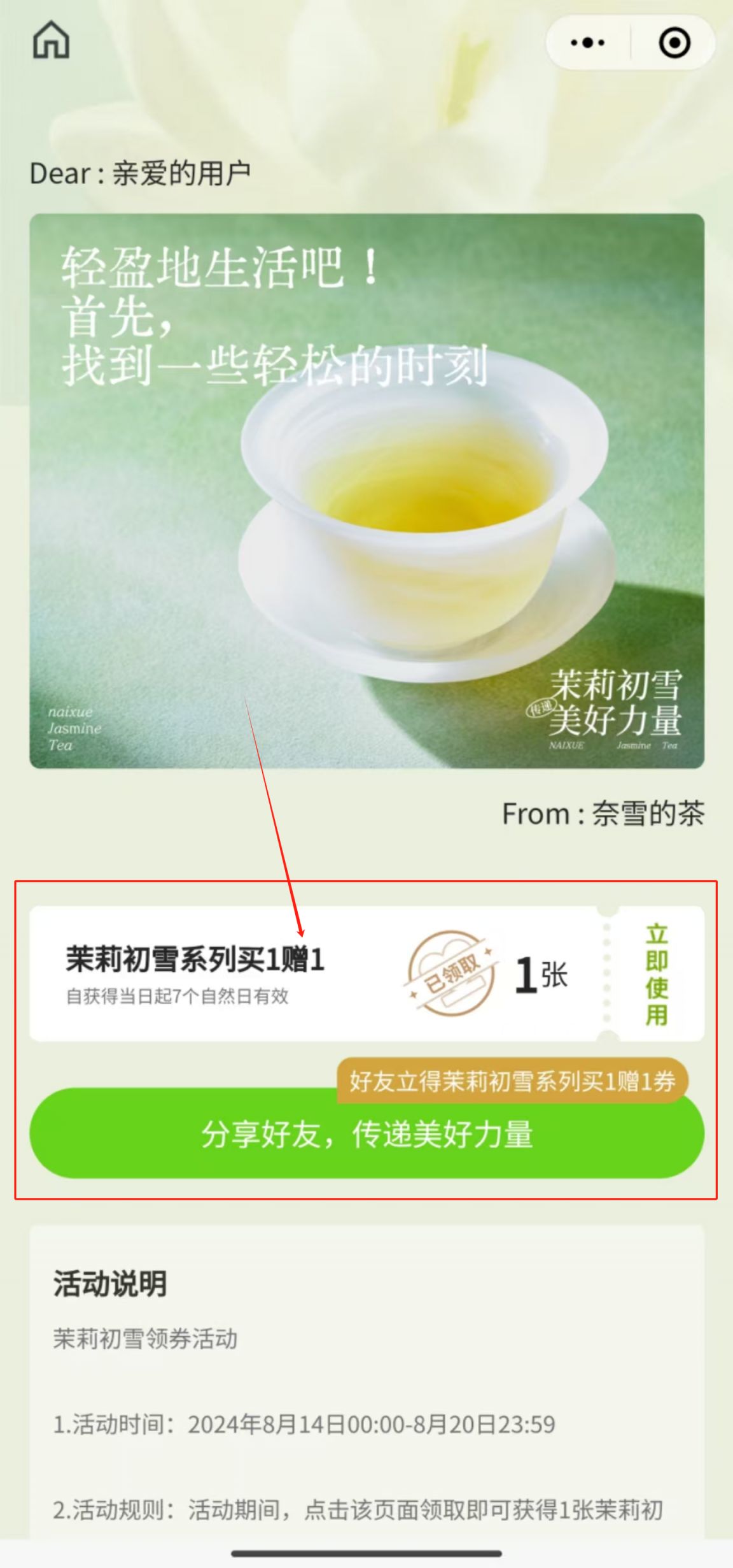 领取方式:活动期间,点击该页面领取即可获得1张茉莉初雪买1赠1优惠券,也可以分享领券链接给好友享买1赠1,奖券立即到账。